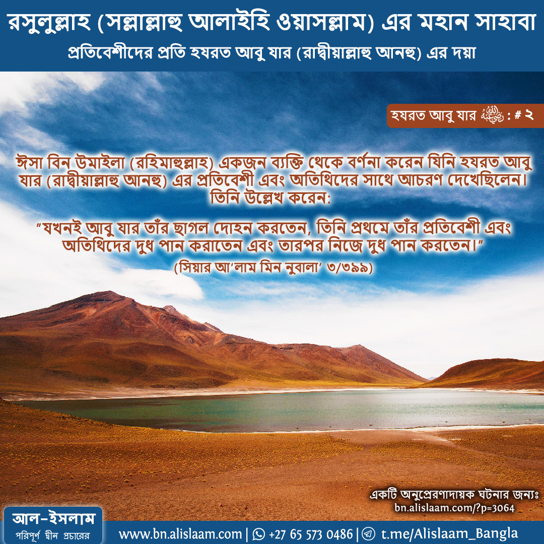 ”যখনই আবু যার তাঁর ছাগল দোহন করতেন, তিনি প্রথমে তাঁর প্রতিবেশী এবং অতিথিদের দুধ পান করাতেন এবং তারপর নিজে দুধ পান করতেন।”