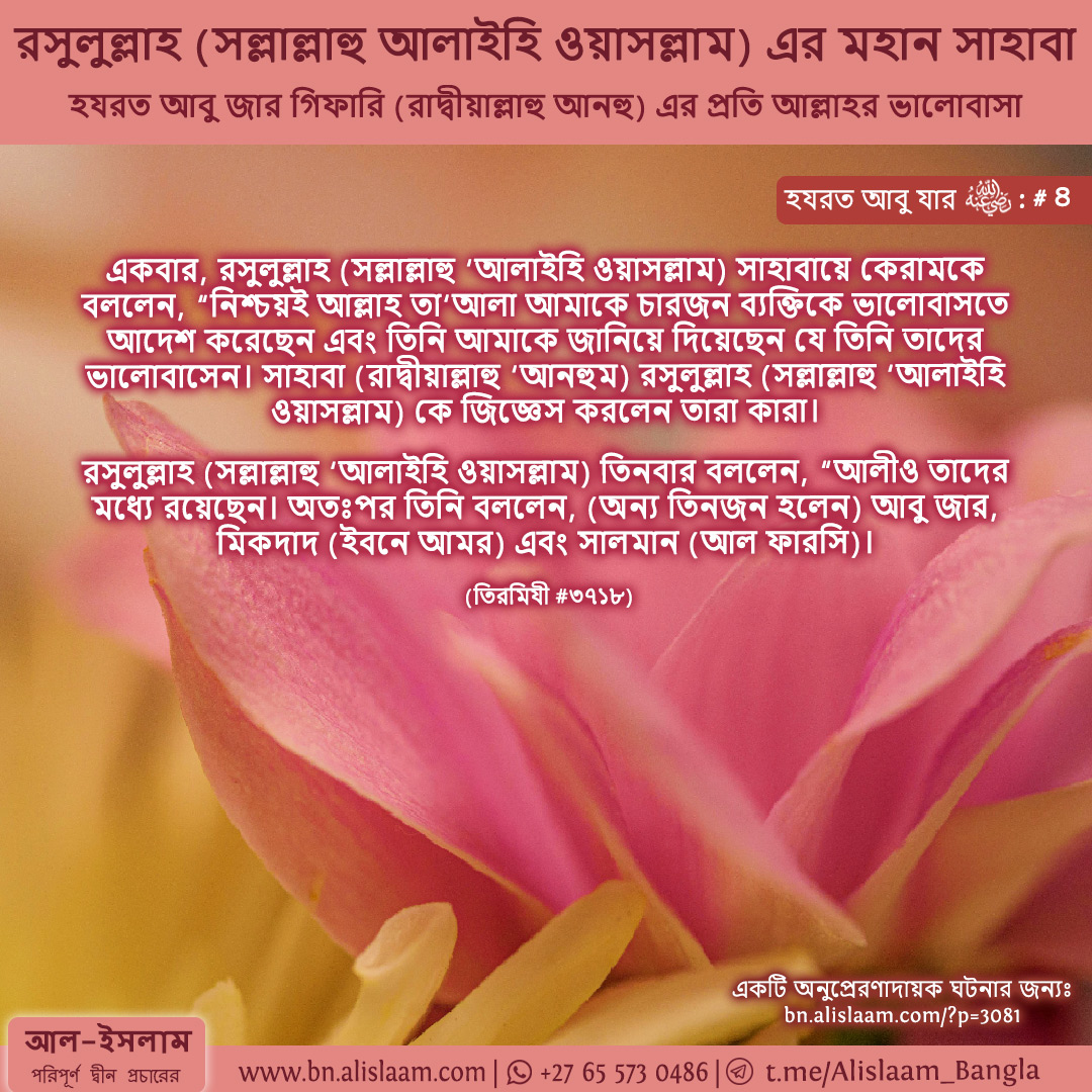 একবার, রসুলুল্লাহ (সল্লাল্লাহু ‘আলাইহি ওয়াসল্লাম) সাহাবায়ে কেরামকে বললেন, “নিশ্চয়ই আল্লাহ তা‘আলা আমাকে চারজন ব্যক্তিকে ভালোবাসতে আদেশ করেছেন এবং তিনি আমাকে জানিয়ে দিয়েছেন যে তিনি তাদের ভালোবাসেন। সাহাবা (রাদ্বীয়াল্লাহু ‘আনহুম) রসুলুল্লাহ (সল্লাল্লাহু ‘আলাইহি ওয়াসল্লাম) কে জিজ্ঞেস করলেন তারা কারা।