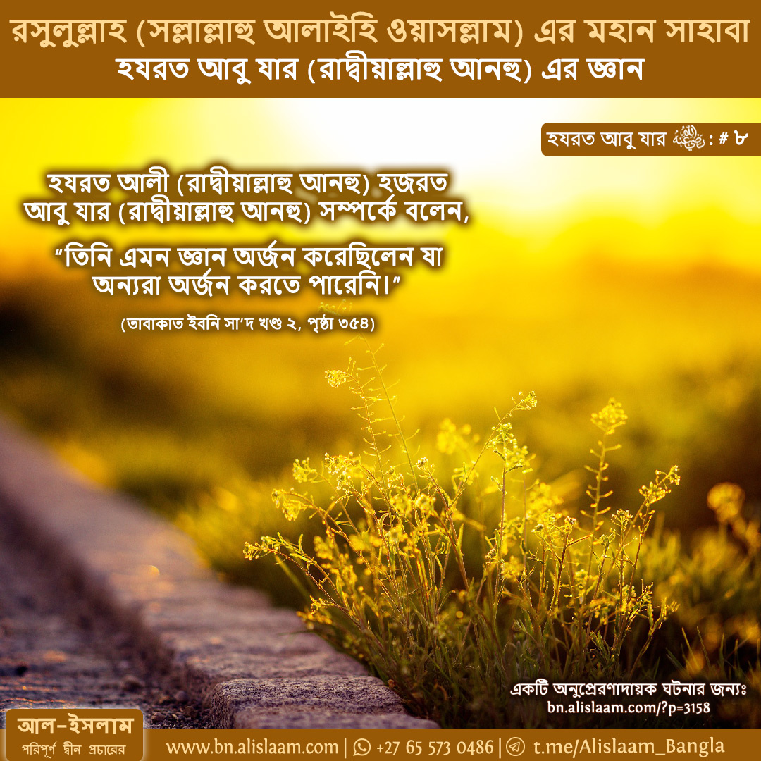 আবু যার (রাদ্বীয়াল্লাহু আনহু) জিজ্ঞাসা করলেন, “তুমি কি কেবল আমার ব্যক্তিগত প্রয়োজনের জন্যই রেখে এসেছিলে?” আমি উত্তর দিলাম, “হ্যাঁ।”