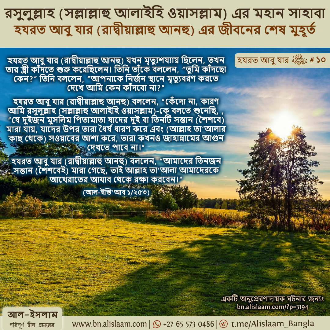 হযরত আবু যার (রাদ্বীয়াল্লাহু আনহু) বললেন, “আমাদের তিনজন সন্তান (শৈশবেই) মারা গেছে, তাই আল্লাহ তা‘আলা আমাদেরকে আখেরাতের আযাব থেকে রক্ষা করবেন।” (আল-ইস্তি’আব ১/২৫৩)