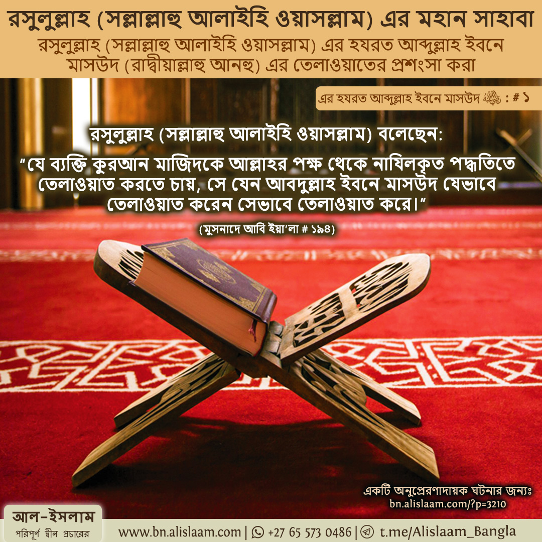 “যে ব্যক্তি কুরআন মাজিদকে আল্লাহর পক্ষ থেকে নাযিলকৃত পদ্ধতিতে তেলাওয়াত করতে চায়, সে যেন আবদুল্লাহ ইবনে মাসউদ যেভাবে তেলাওয়াত করেন সেভাবে তেলাওয়াত করে।” (মুসনাদে আবি ইয়া’লা # ১৯৪)